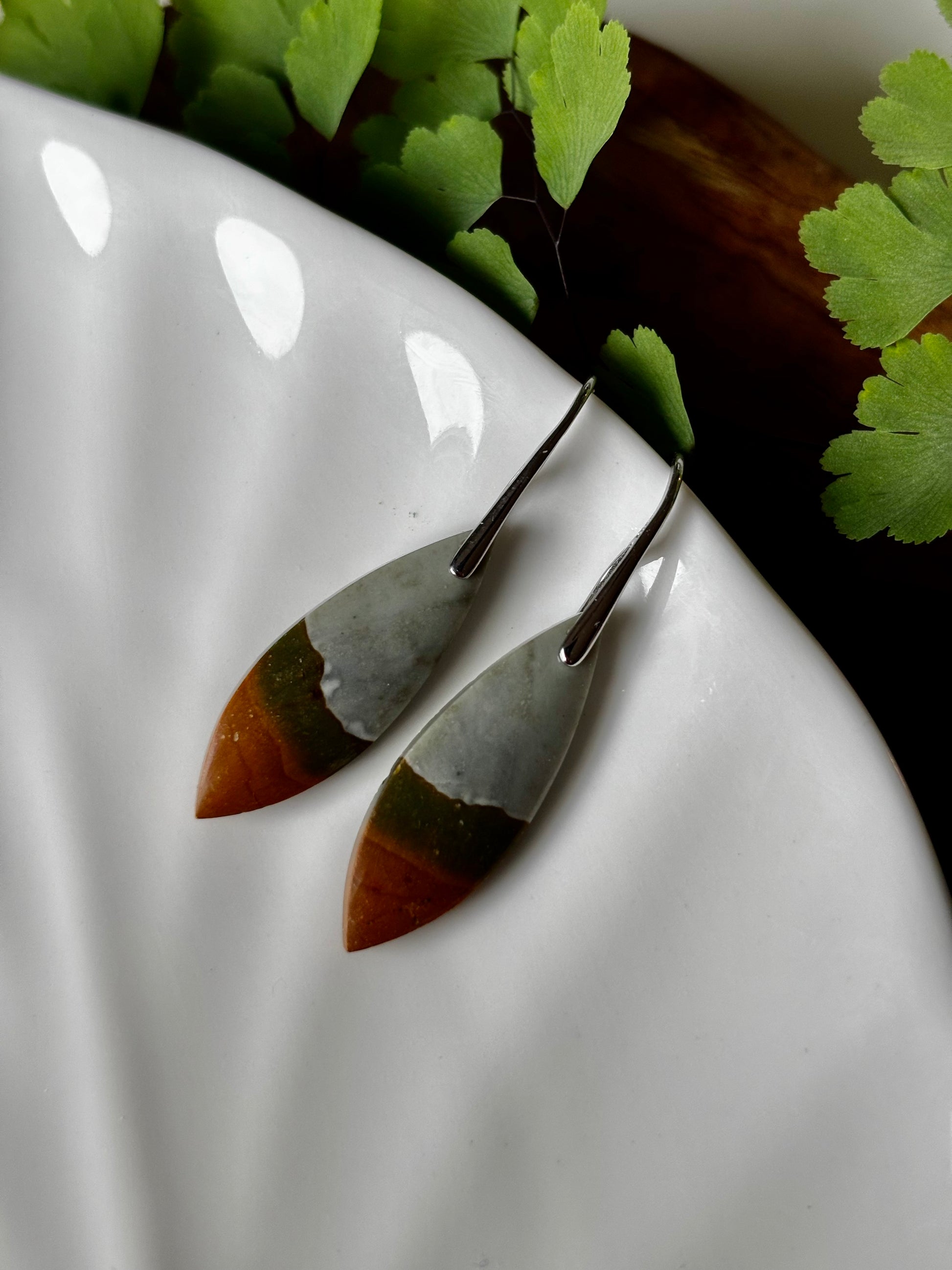 Full of rich, warm tones and natural patterns, Polychrome Jasper is a stone of action, inspiration, and vitality. It’s also deeply grounding, encouraging balance and a strengthened connection to Mother Earth. These earrings highlight the unique character of the stone, paired with sterling silver hooks for an earthy, elevated finish.