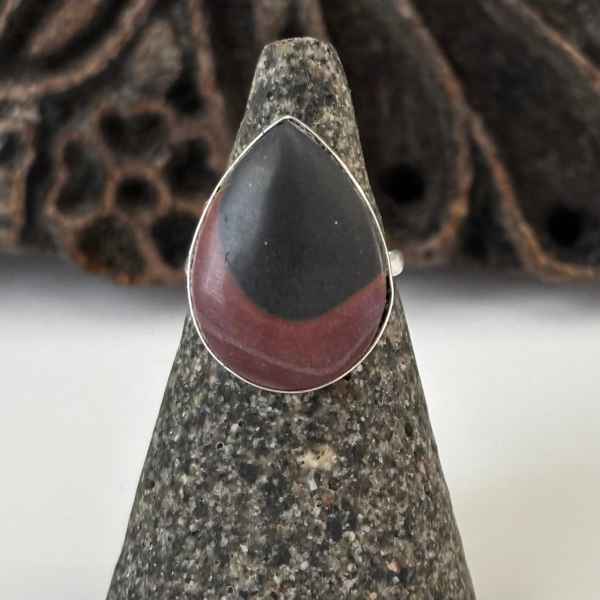 This Polychrome Jasper reveals striking swirls of deep red and black — colors born from volcanic energy and mineral transformation over time. Each stone feels powerful and grounded, with natural movement and depth that catch the light beautifully. Set in sterling silver, it’s bold yet timeless.